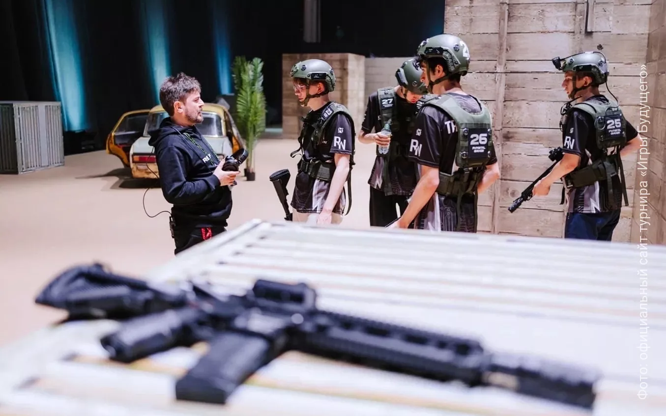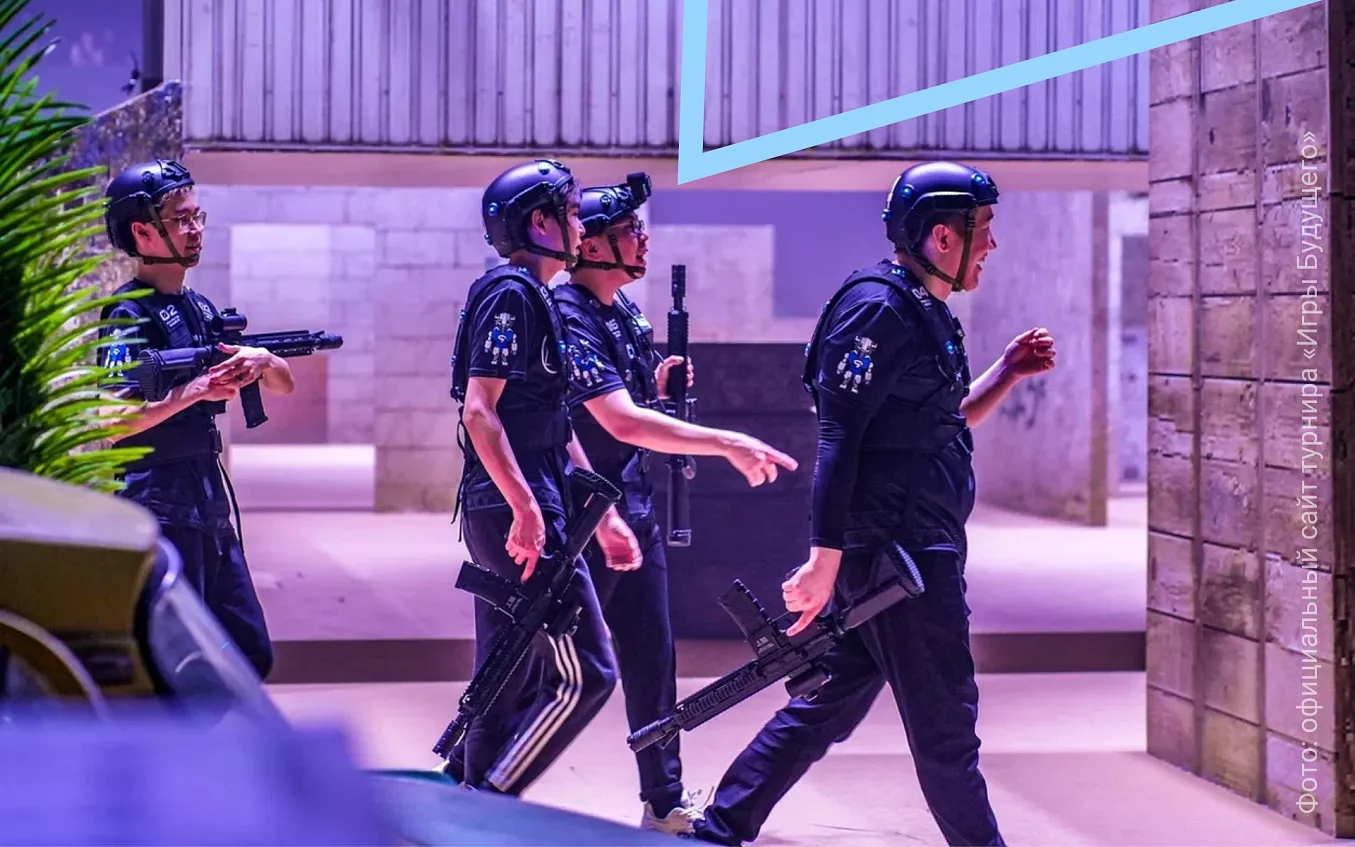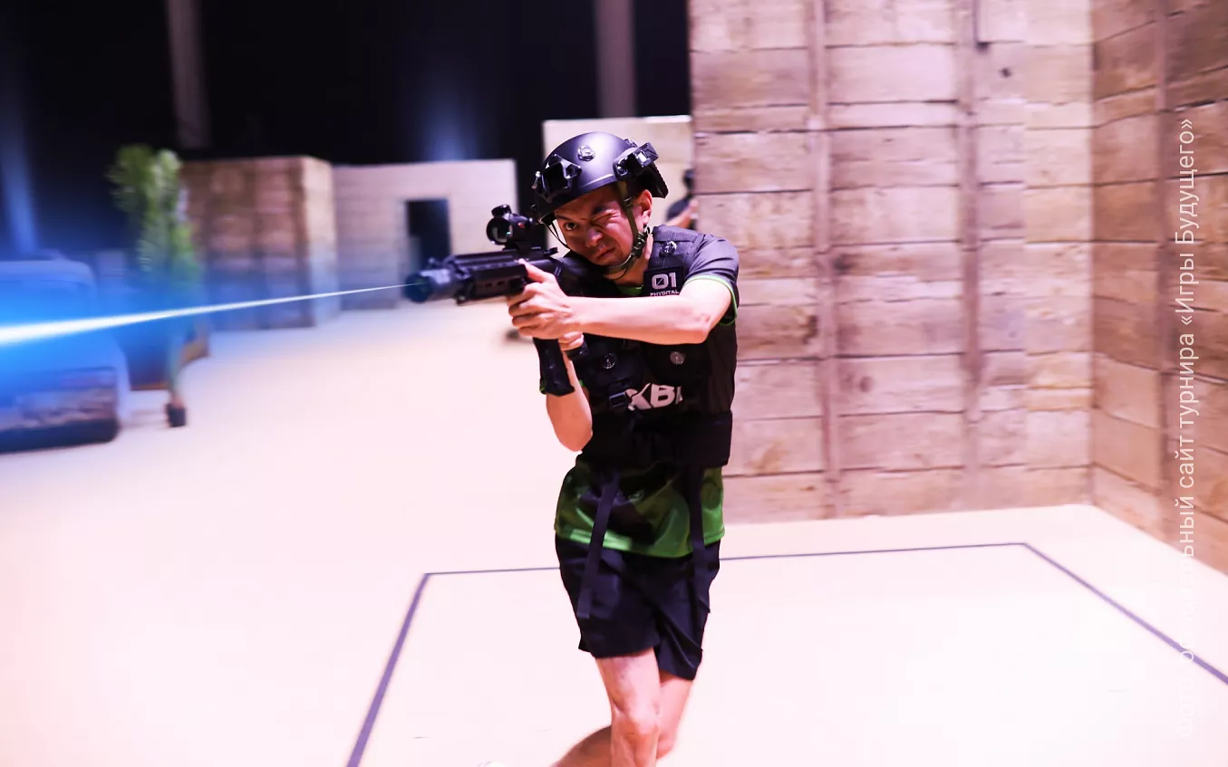 Спортсмены состязаются в стрелковой видеоигре и на физическом полигоне с использованием лазерного оружия:
