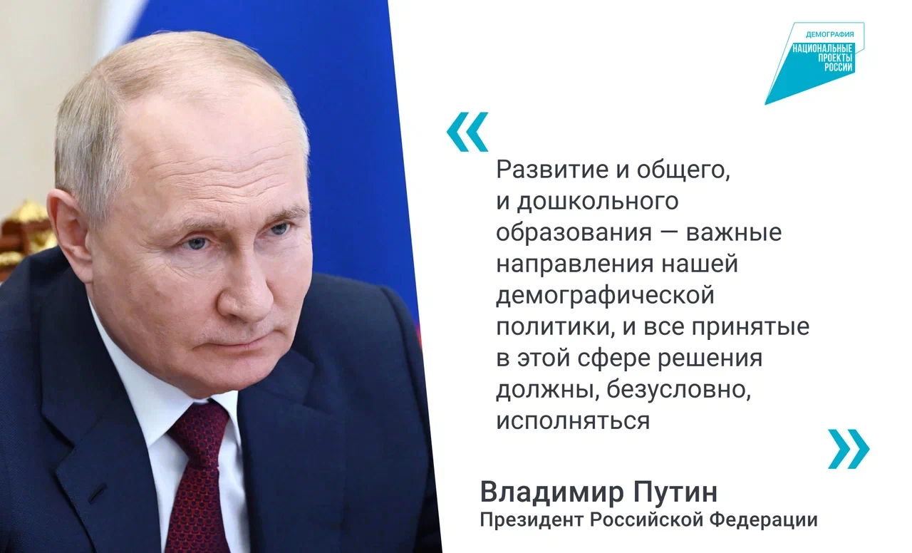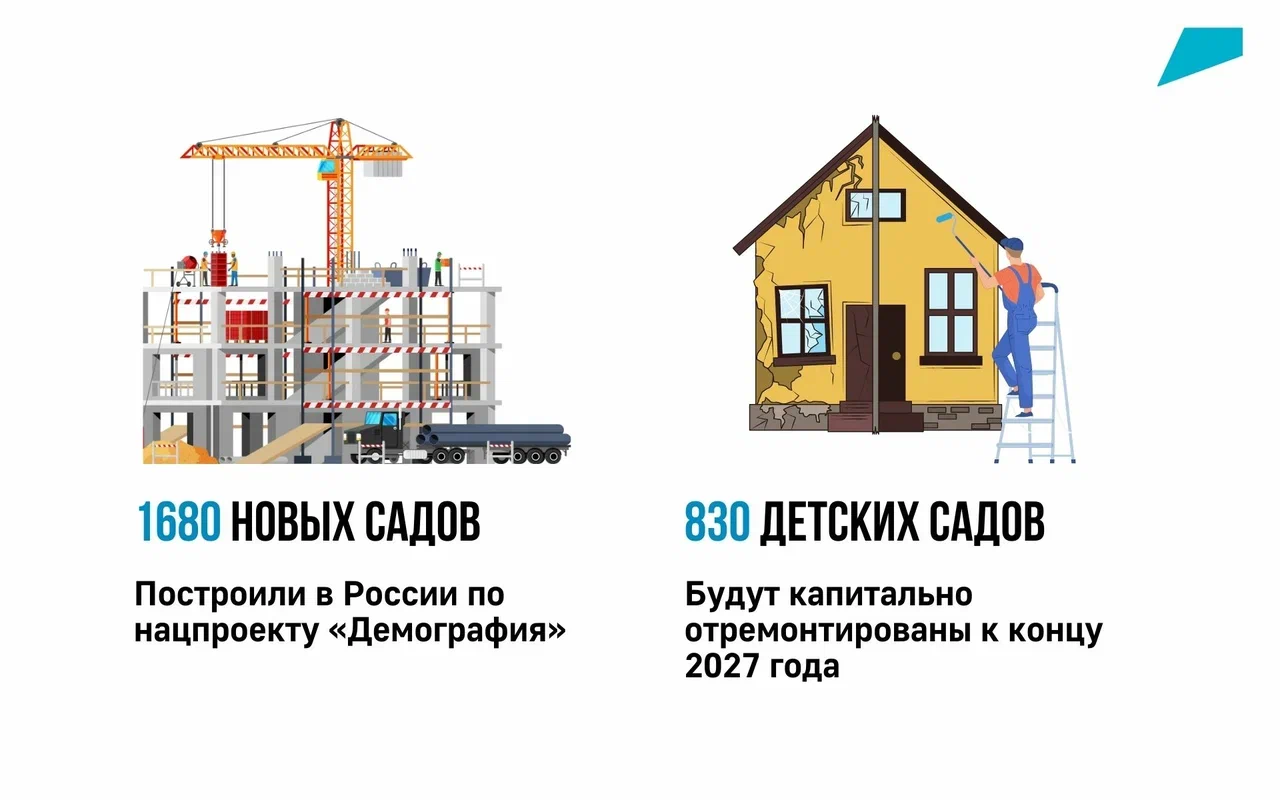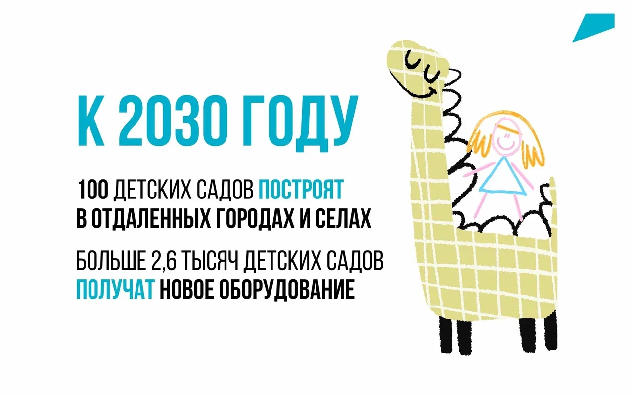 Всего благодаря нацпроекту «Демография» во всех регионах России построили 1680 детских садов, а к концу 2027 года 830 детских садов капитально отремонтируют. Больше 2,6 тысяч садиков, не требующих ремонта, к 2030 году получат новое оборудование – учебные пособия, игрушки, спортивные снаряды. И еще 100 детских садов в ближайшие шесть лет построят в отдаленных населенных пунктах.