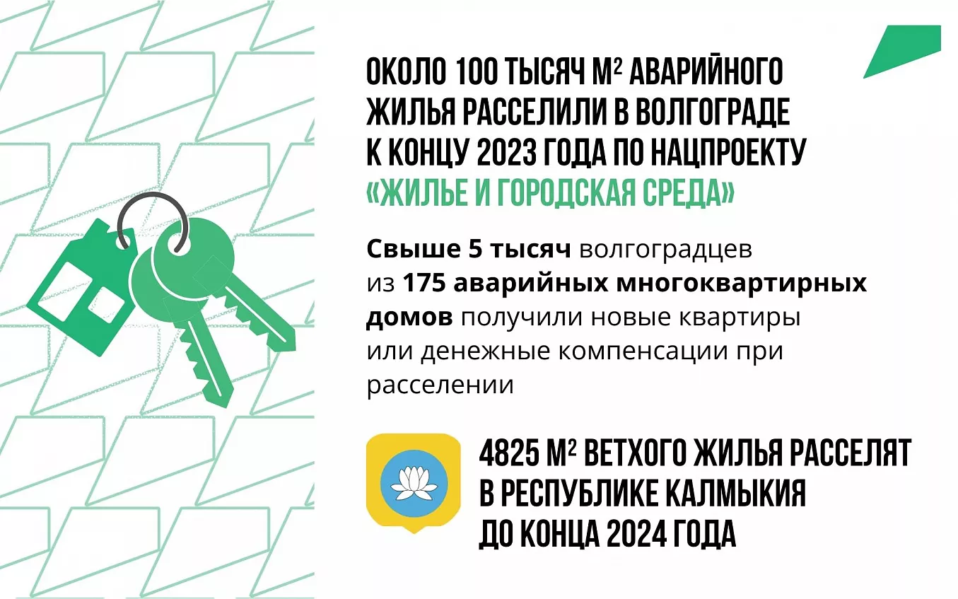 В Республике Калмыкия, например, где уже переселили всех жителей ветхого фонда, учтенного до 2017 года, до конца 2024 года расселят еще 4825 м² ветхого жилья.