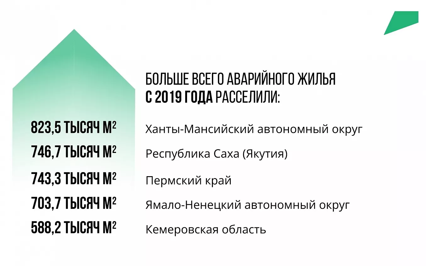 Регионы-рекордсмены, расселившие больше всего аварийного жилья, – Ханты-Мансийский автономный округ, где расселили 823,5 тысяч м², Республика Саха (Якутия) – 746,7 тысяч м², Пермский край – 743,3 тысяч м², Ямало-Ненецкий автономный округ – 703,7 тысяч м², Кемеровская область – 588,2 тысяч м². В целом по стране только за первые три месяца 2024 года в новые квартиры переехали 32,8 тысяч человек, которые жили на 540 тысячах м² в аварийных домах.