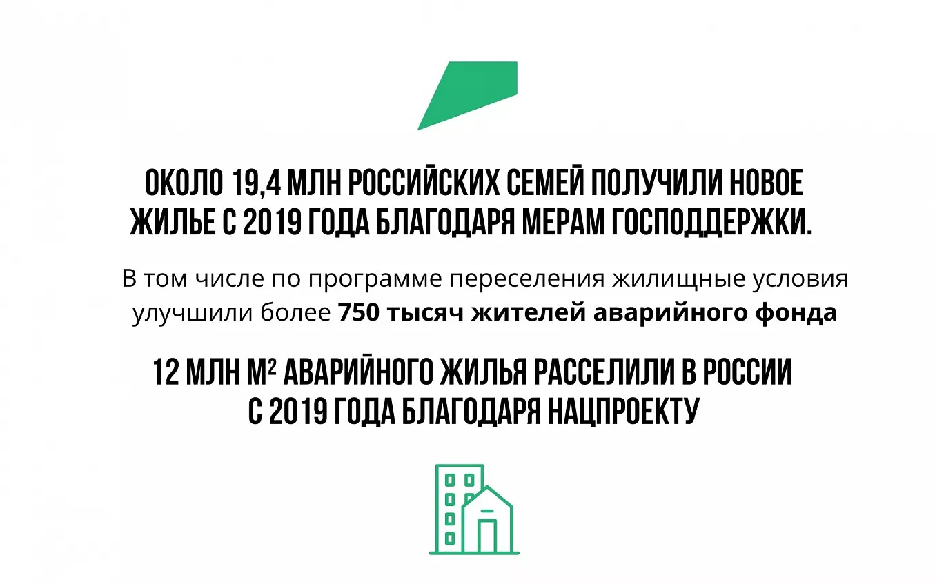 С 2019 года жилищные условия улучшили более 750 тысяч жителей аварийного фонда. Благодаря нацпроекту за 5 лет в России расселили 12 млн м² аварийного жилья.