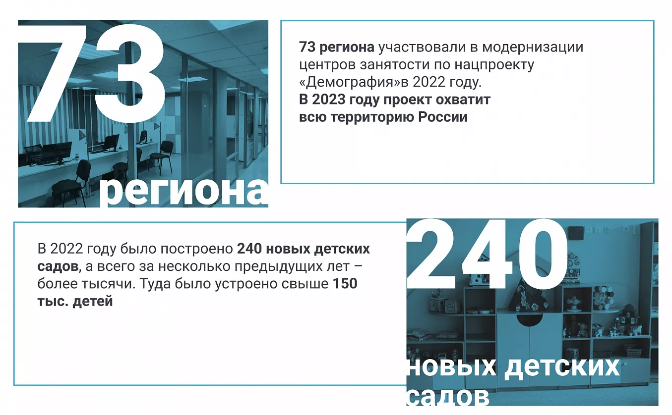 Не менее важное направление деятельности — строительство современных детских садов с ясельными группами и открытие дополнительных групп для малышей до трёх лет в уже работающих садиках. Еще несколько лет назад во многих регионах получить место в дошкольном учреждении было практически нереально. Для работающих родителей это становилось огромной проблемой. Благодаря нацпроекту «Демография» ситуация начала меняться. Новые удобные садики с отдельными помещениями для игр, спорта и приема пищи, оснащённые развивающим и игровым оборудованием, открываются по всей стране, причем особое внимание уделяется именно малым населённым пунктам. Мамы могут быстрее вернуться на работу, не беспокоясь о том, с кем оставить ребенка. К концу 2023 года планируется полностью ликвидировать очереди в детские сады для детей в возрасте от 1,5 до 3 лет.