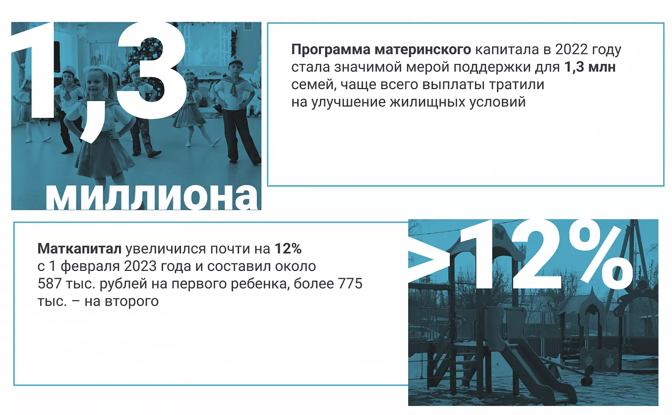 Программа материнского капитала была запущена в 2007 году по инициативе Президента РФ Владимира Путина. Со временем её значительно расширили, появились другие «детские» выплаты, которые ежегодно индексируются. Уже к 2015 году рождаемость обновила рекорд и составила 1,94 млн человек, и в последующие годы оставалась стабильно высокой относительно базы 90-х.