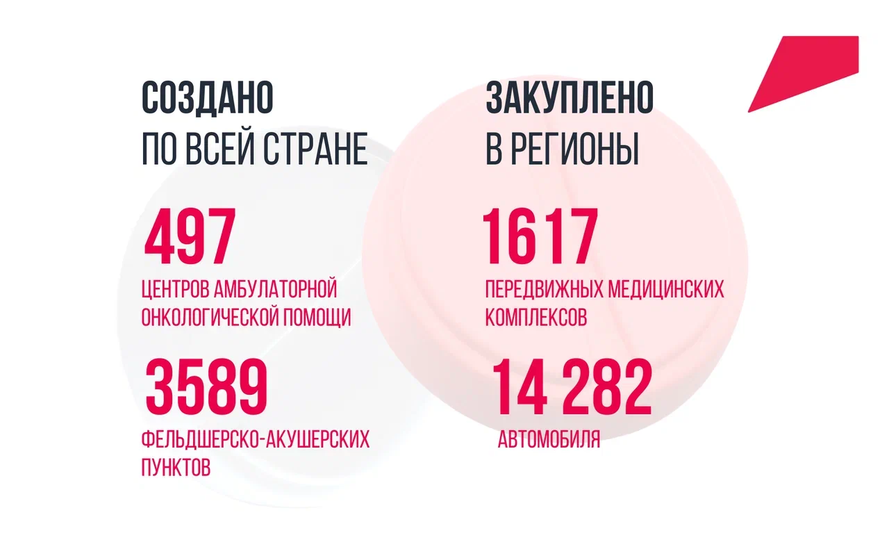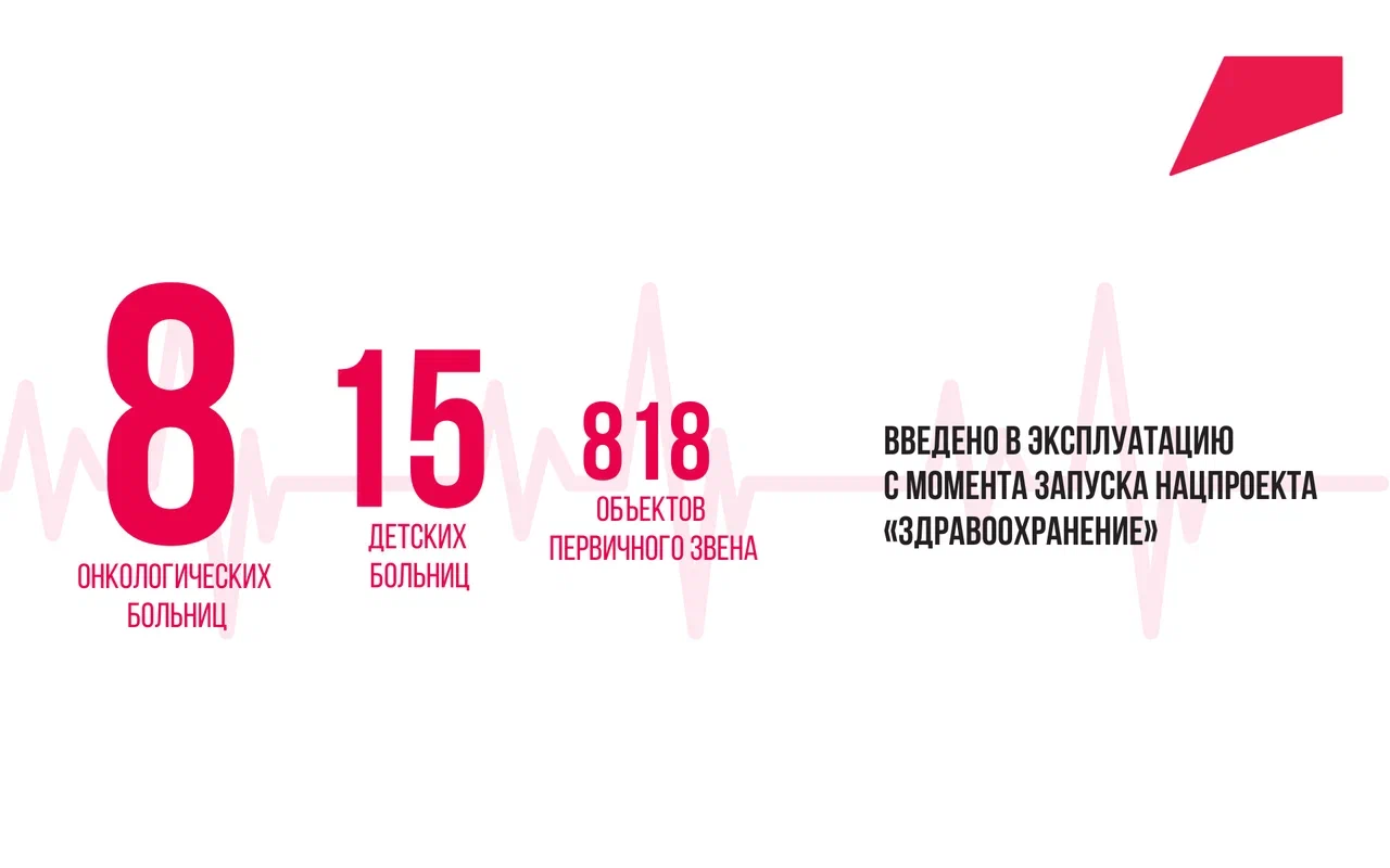 Всего за время работы по нацпроекту «Здравоохранение» построили и открыли 818 объектов первичного звена, 8 онкологических и 15 детских больниц. За это время появилось 497 центров амбулаторной онкологической помощи и 3589 фельдшерско-акушерских пунктов. Регионы получили 1617 передвижных медицинских комплексов и 14 282 автомобиля.