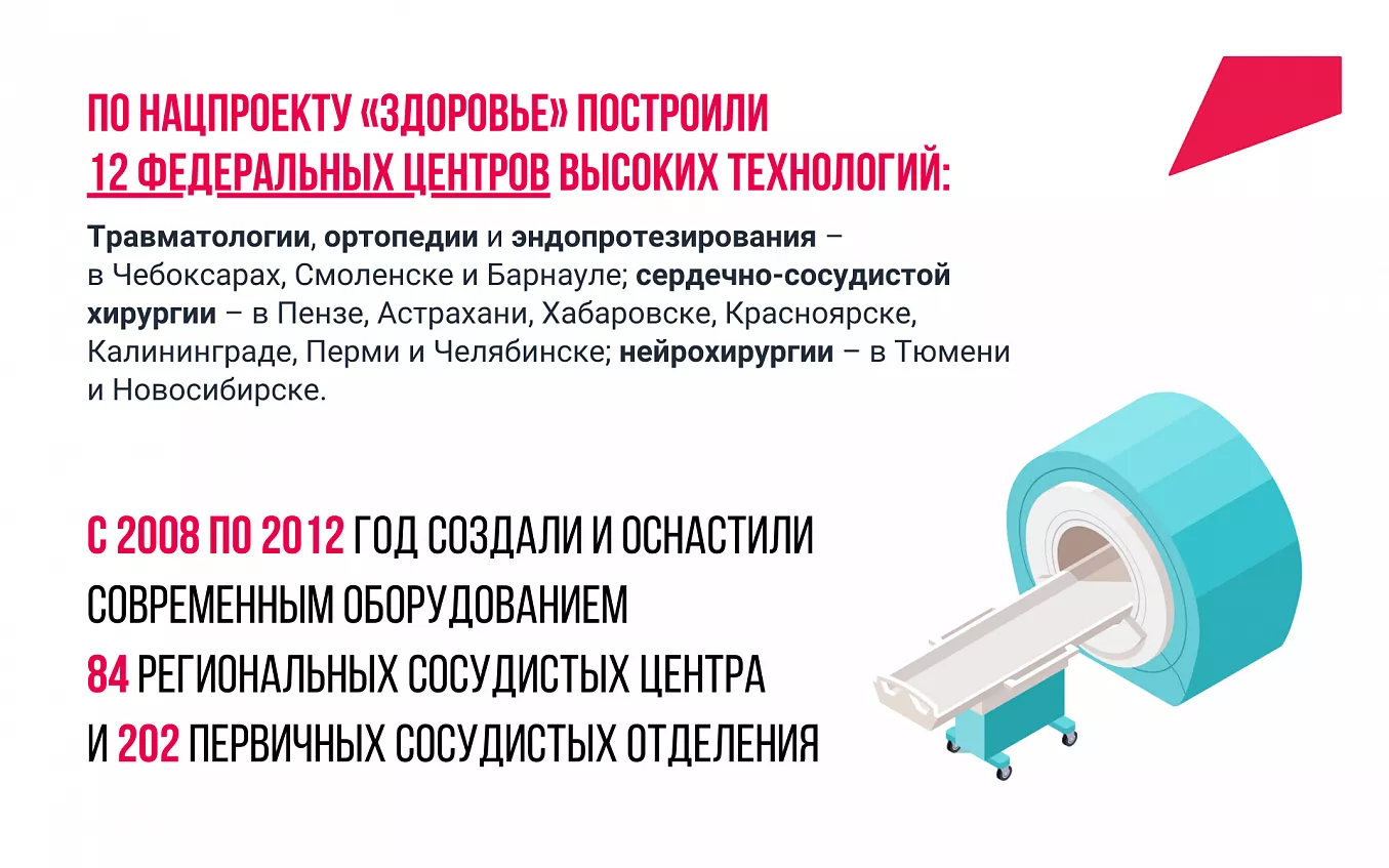 По нацпроекту «Здоровье» построили 12 федеральных центров высоких технологий: травматологии, ортопедии и эндопротезирования – в Чебоксарах, Смоленске и Барнауле; сердечно-сосудистой хирургии – в Пензе, Астрахани, Хабаровске, Красноярске, Калининграде, Перми и Челябинске; нейрохирургии – в Тюмени и Новосибирске.