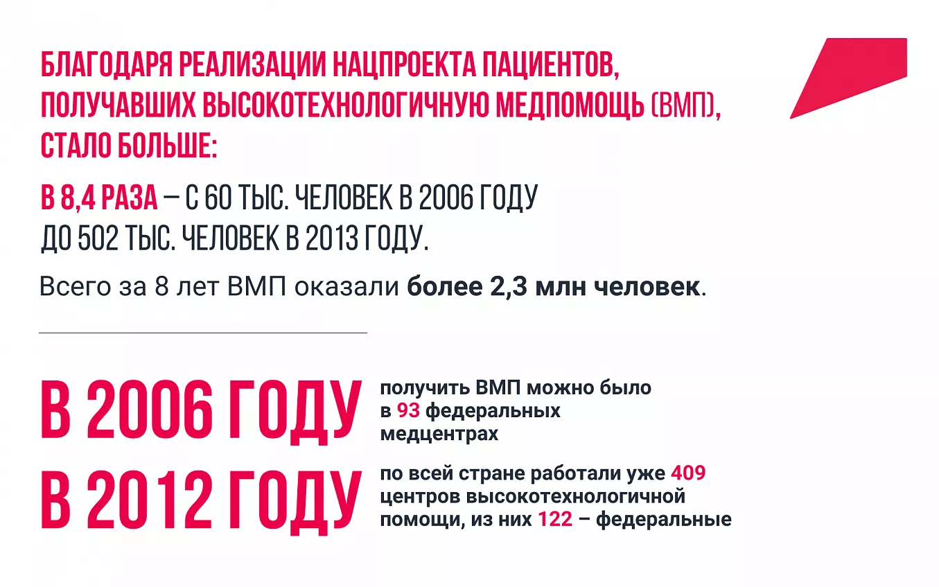 Благодаря его реализации пациентов, получавших высокотехнологичную медпомощь (ВМП), стало больше в 8,4 раза – с 60 тысяч человек в 2006 году до 502 тысяч человек в 2013 -м. Всего за 8 лет ВМП оказали более 2,3 млн человек.