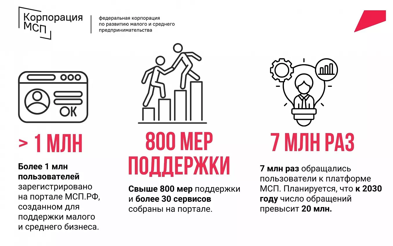 Платформа МСП.РФ создана для поддержки бизнеса по нацпроекту «Малое и среднее предпринимательство». Она доступна во всех регионах России. На платформе зарегистрировано уже больше 1 млн человек. По данным на 2024 год, ей воспользовались 7 млн раз. Планируется, что к 2030 году обращений будет больше 20 млн.