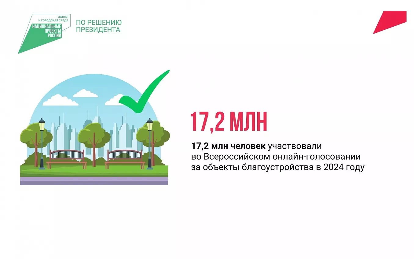 Проголосовать за объекты благоустройства в своем регионе, городе или даже дворе жители России старше 14 лет могут с помощью сервиса «Активный гражданин» на портале Госуслуг. Всероссийское голосование проходит и на сайте za.gorodsreda.ru. В 2024 году в нем участвовали 17,2 млн человек – на 3 млн больше, чем годом раньше.