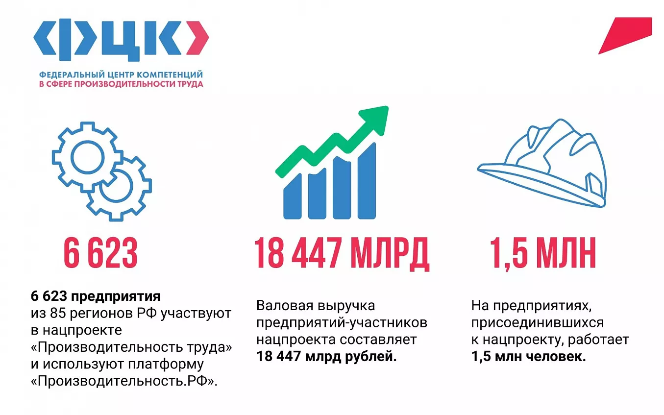Повышать эффективность рабочих процессов помогает цифровая платформа производительность.рф. Предприятия-участники нацпроекта получают доступ к базе всероссийских и мировых методик и практик. По данным на 2024 год, в проект вовлечены 6623 предприятия из 85 регионов РФ с валовой выручкой 18 447 млрд рублей и около 1,5 млн работников.