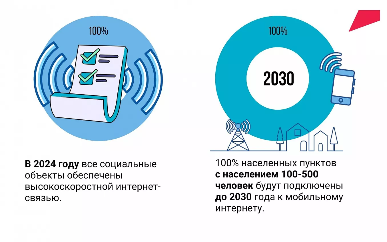 В 2024 году все социальные объекты обеспечены высокоскоростным интернетом, а к 2030 году его проведут во все поселки с населением 100–500 человек. В медицинских учреждениях минимальная скорость – 10 Мбит/сек, в сельских школах – не менее 50 Мбит/сек, в городских – от 100 Мбит/сек.
