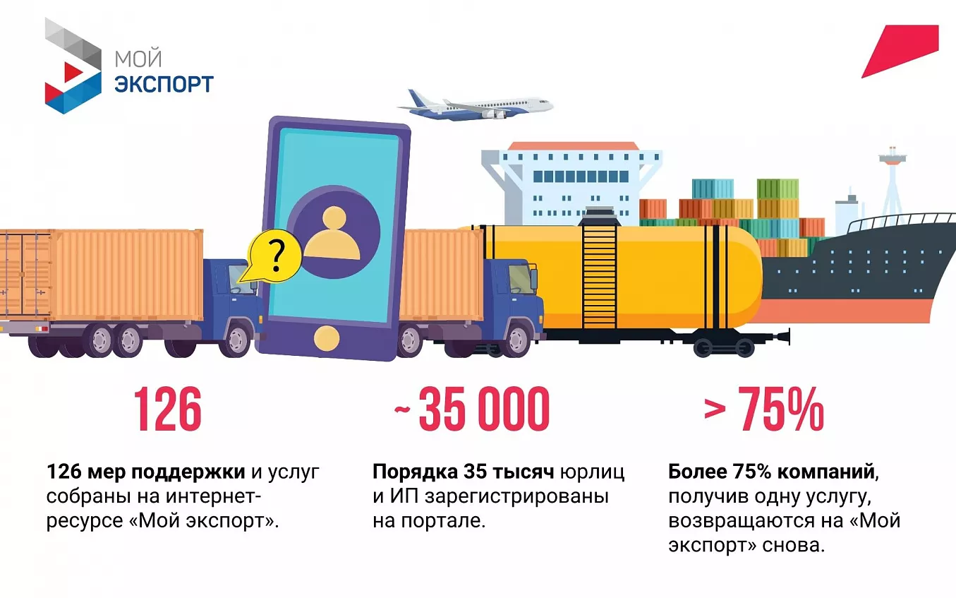 По нацпроекту «Международная кооперация и экспорт» создана платформа «Мой экспорт». На ней собраны 126 актуальных мер поддержки и услуг для начинающих и опытных экспортеров. На платформе зарегистрированы почти 35 тысяч юрлиц и ИП. Ежедневно ее посещают почти 5 тысяч пользователей. Более 75% компаний, получив услугу, возвращаются на «Мой экспорт» снова. А всего на платформе оказано уже более 1 млн услуг.