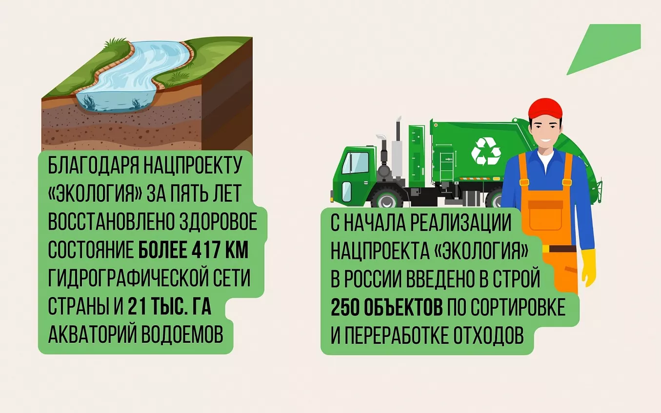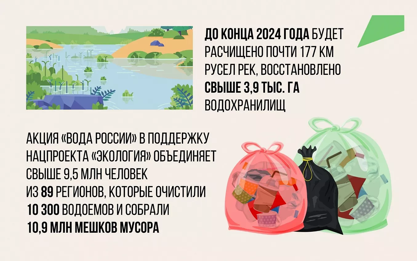 Федеральный проект «Сохранение уникальных водных объектов» – одно из направлений нацпроекта «Экология». Благодаря нацпроекту за пять лет улучшено состояние более 417 км гидрографической сети страны и 21 тысячи гектаров акваторий водоемов. До конца 2024 года расчистят почти 177 км русел рек и восстановлено свыше 3,9 тысяч гектаров водохранилищ.