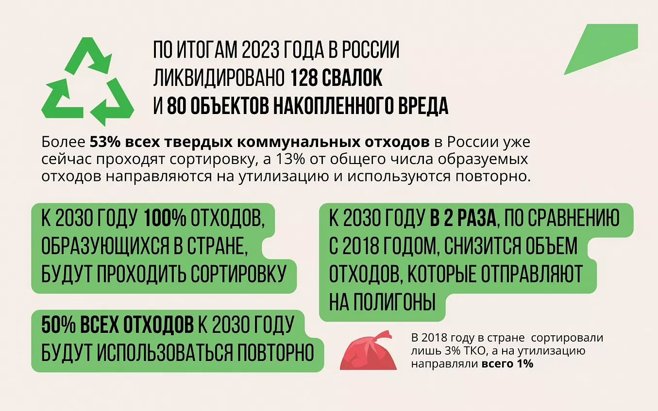 Выступая перед федеральным собранием, Президент поставил несколько масштабных задач, которые необходимо решить до 2030 года, в частности по сортировке и переработке твердых коммунальных отходов. Основная – 100% коммунальных отходов должны проходить сортировку, а 50% – использоваться повторно. Нужно также в два раза снизить объем отходов, захораниваемых на полигонах.