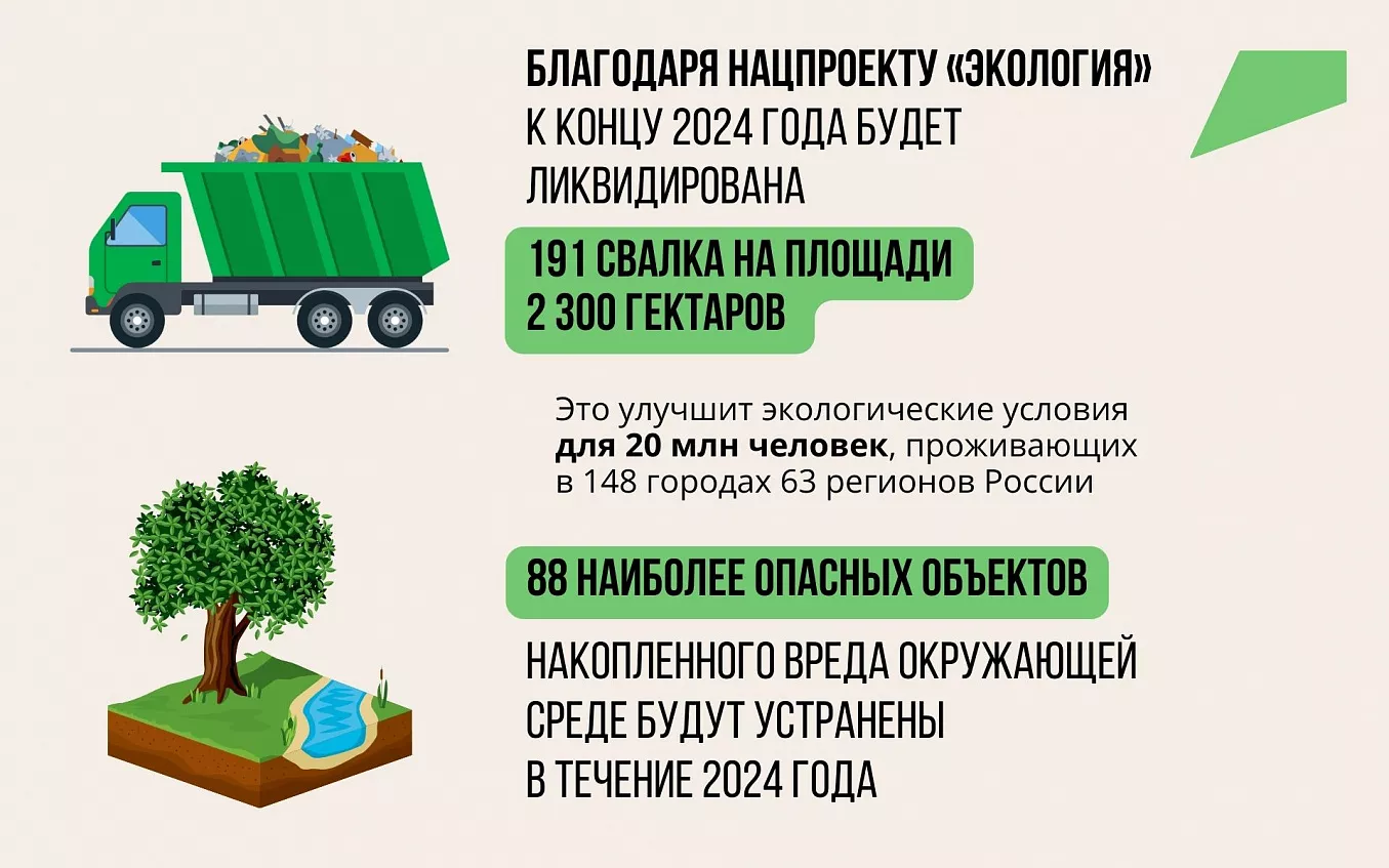 К концу 2024 года благодаря нацпроекту «Экология» будет ликвидирована 191 свалка на площади 2300 гектаров, что улучшит условия жизни 20 млн человек в 148 городах России.