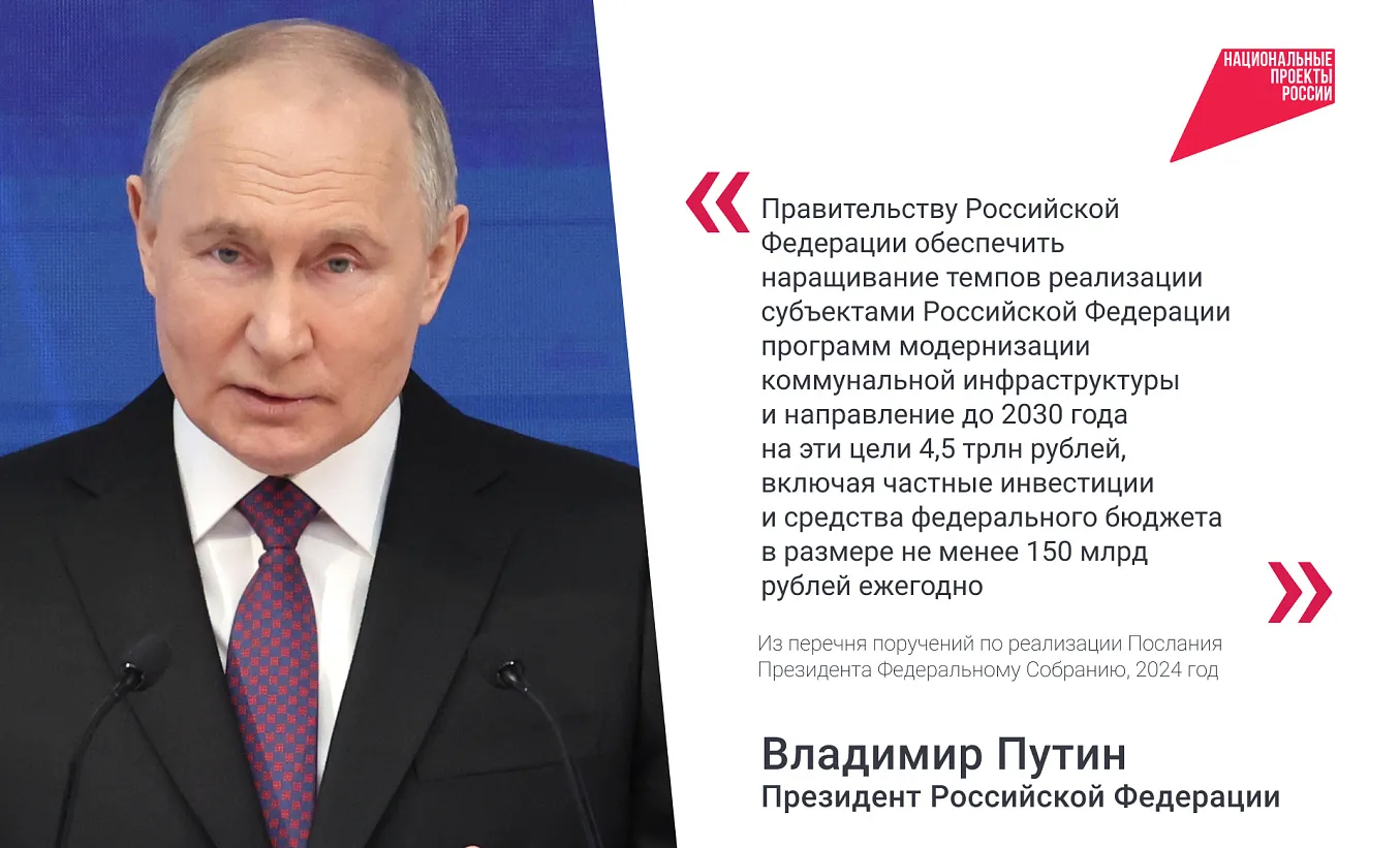 До конца 2026 года построят, модернизируют и отремонтируют ещё не менее 1506 объектов тепло-, водоснабжения и водоотведения. При таком темпе работ к 2030 году качество коммунальных услуг улучшится для 20 млн человек.