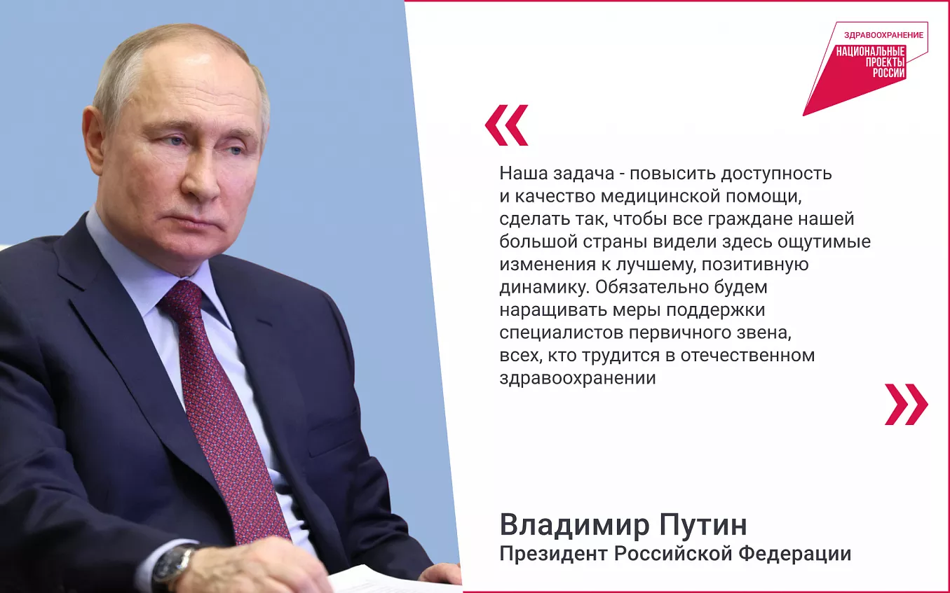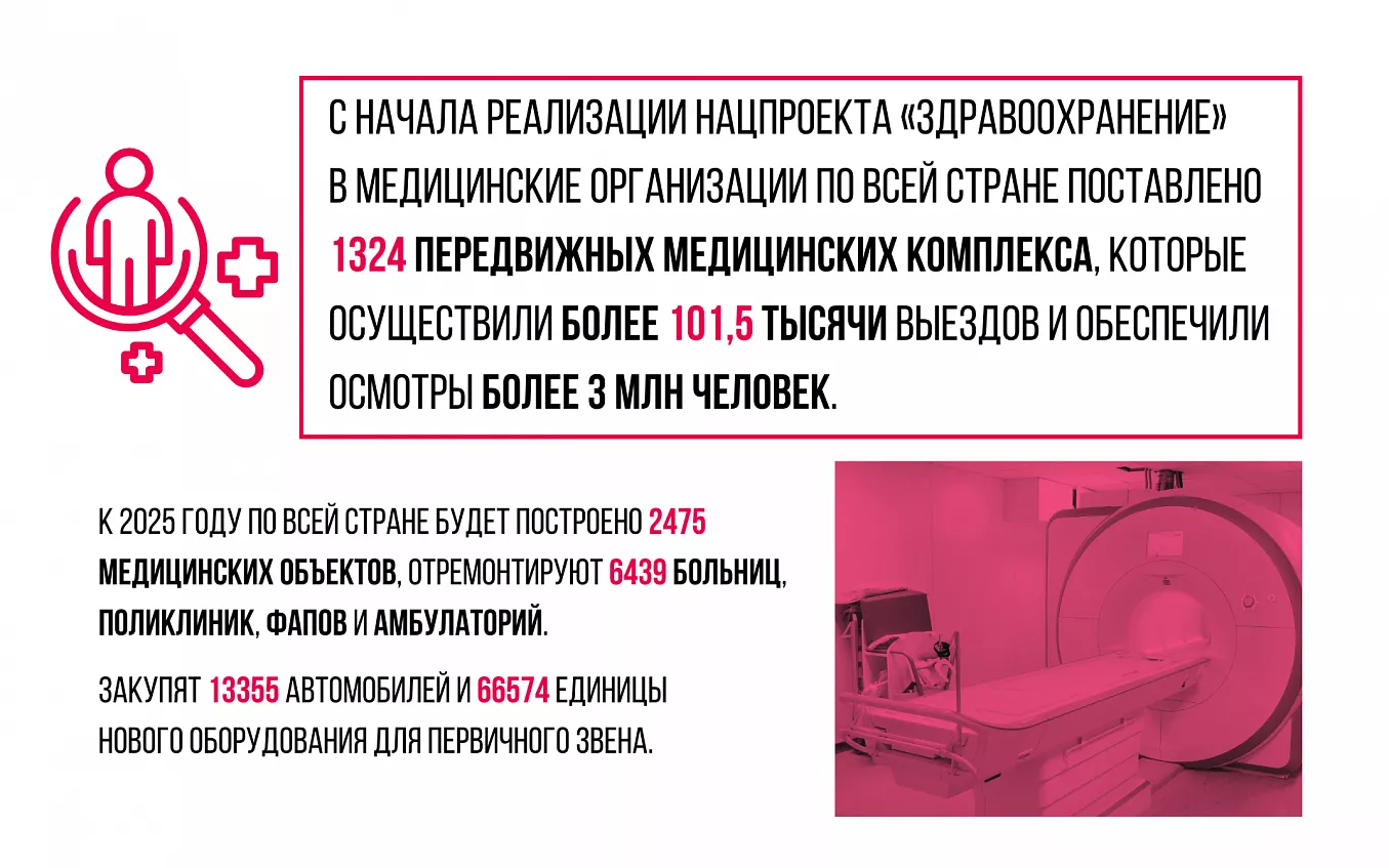 В 2019 году в соответствии с Указом президента РФ Владимира Путина был создан национальный проект «Здравоохранение», призванный снизить показатели смертности, обеспечить максимальную доступность профилактических осмотров и медико-санитарной помощи для всех граждан, особенно в отдаленных районах, а также повысить уровень медицинских услуг в поликлиниках и больницах. Для этого в рамках нацпроекта с 2022 года реализуется федеральный проект «Модернизация первичного звена здравоохранения Российской Федерации». Он рассчитан до 2025 года. Особое внимание уделяется доступности первичной медицинской помощи на отдаленных территориях, в маленьких поселках и деревнях. Всего по стране фиксируется более 1 млрд обращений в медучреждения первичного звена в год – это наиболее заметная, базовая часть системы здравоохранения. Новые и старые ФАПы, поликлиники, больницы, амбулатории строят и модернизируют в соответствии с современными требованиями. В том числе внедряют систему «бережливых поликлиник», которая предусматривает повышение эффективности рабочих процессов, удобные навигацию и размещение кабинетов, минимальное время ожидания приема, комфортные условия для посетителей и медицинского персонала.