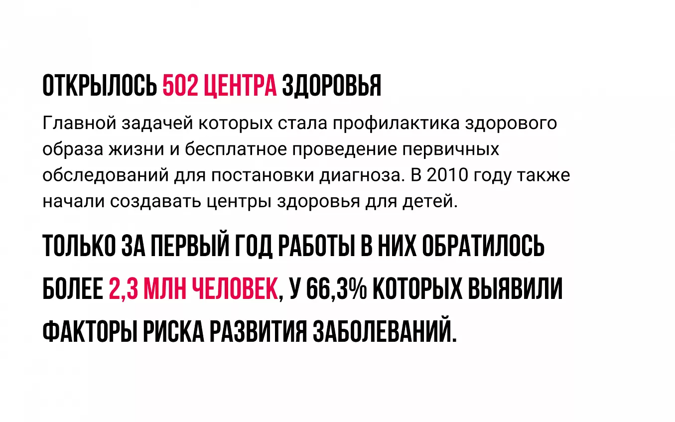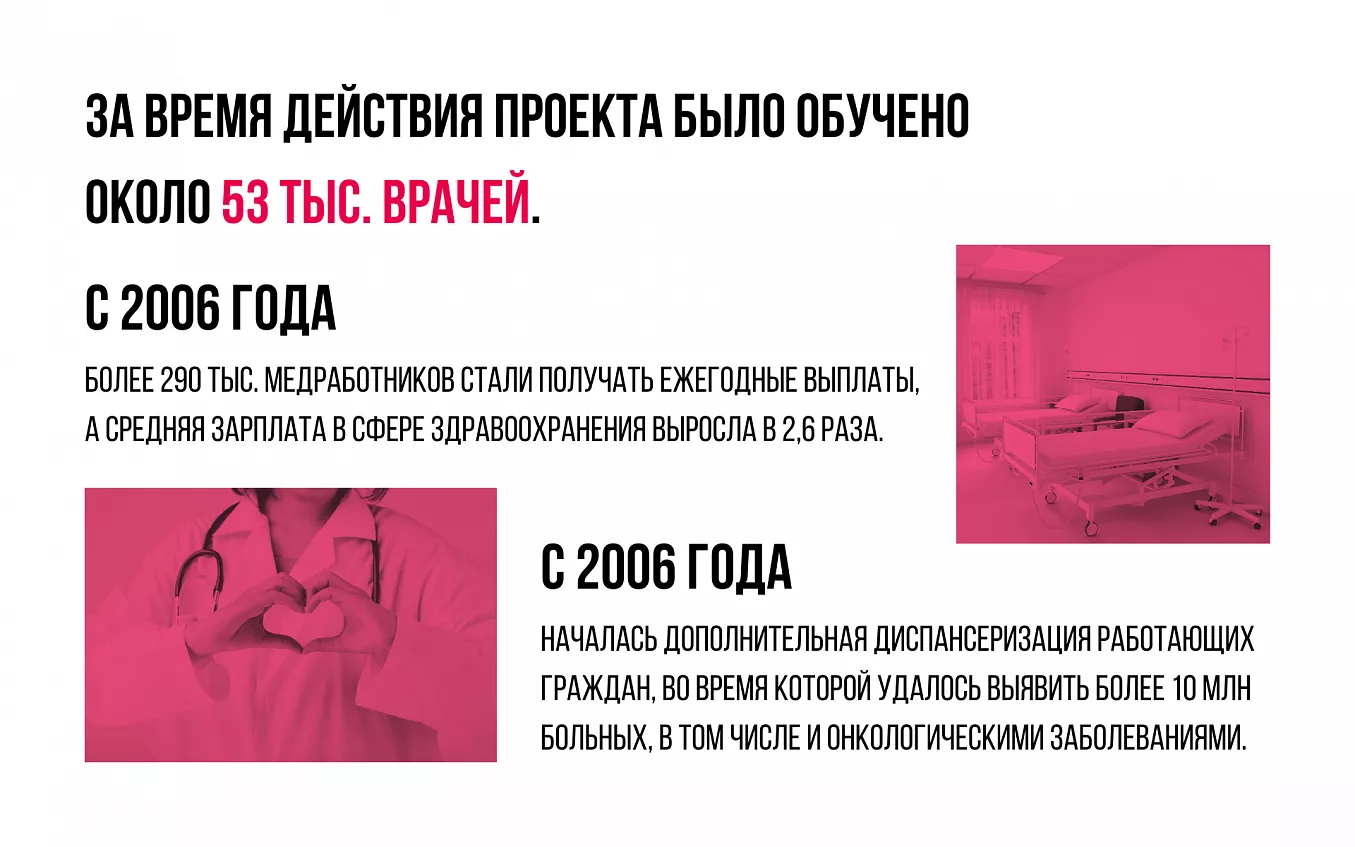 Ситуация начала кардинально меняться в «нулевые» годы. С 2006 года стартовал масштабный приоритетный национальный проект «Здоровье». Ввели и поэтапно совершенствовали систему лечения по ОМС, внедряли общеврачебные стандарты и практики на уровне первичного звена здравоохранения, медико-санитарной помощи. В 2006–2007 годах привлекли дополнительные средства и одновременно сократили государственные расходы. Развитие высокотехнологичной медицины, разработка и внедрение инновационного оборудования стали происходить по принципу софинансирования.