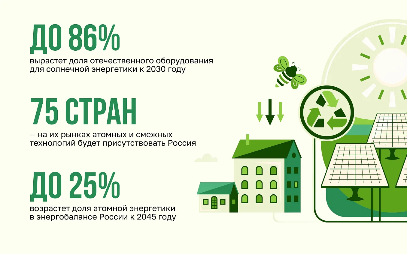 В 2025 году по инициативе Президента России Владимира Путина стартовал нацпроект «Новые атомные и энергетические технологии». По федеральному проекту «Новое оборудование и технологии в солнечной и ветрогенерации» к 2030 году планируется достичь независимости от импорта в этой сфере на уровне 90%. Для этого ведут разработки, в том числе инновационные. Например, гетероструктурные фотоэлектрические преобразователи (солнечные ячейки), эффективность которых превысит 25%. Доля отечественного оборудования для солнечной энергетики должна вырасти до 86% к 2030 году.