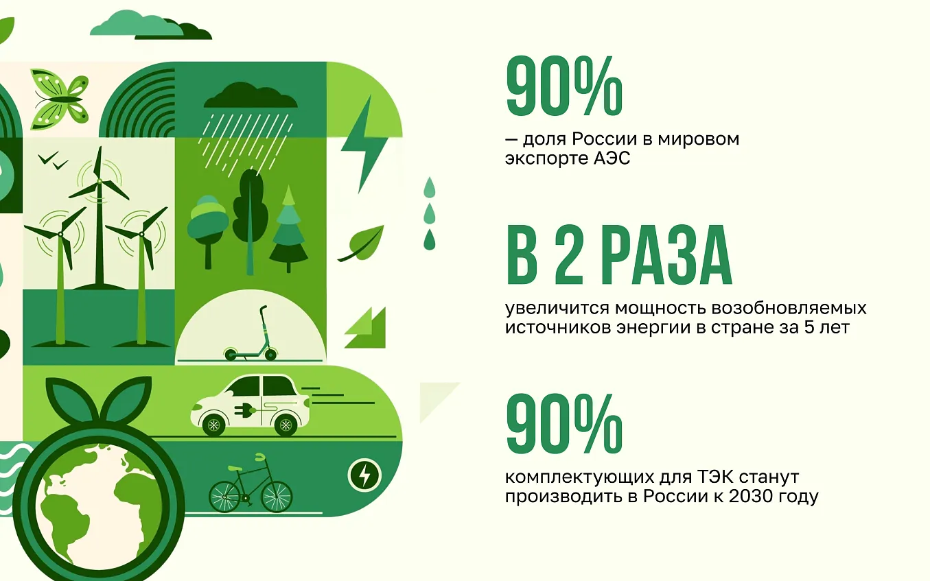 Важный федпроект – «Серийная референтность атомных электростанций большой и малой мощности». По нему строят новые блоки АЭС, а значит, растет доля ядерной энергии в общем энергобалансе страны. К 2045 году она составит 25%.