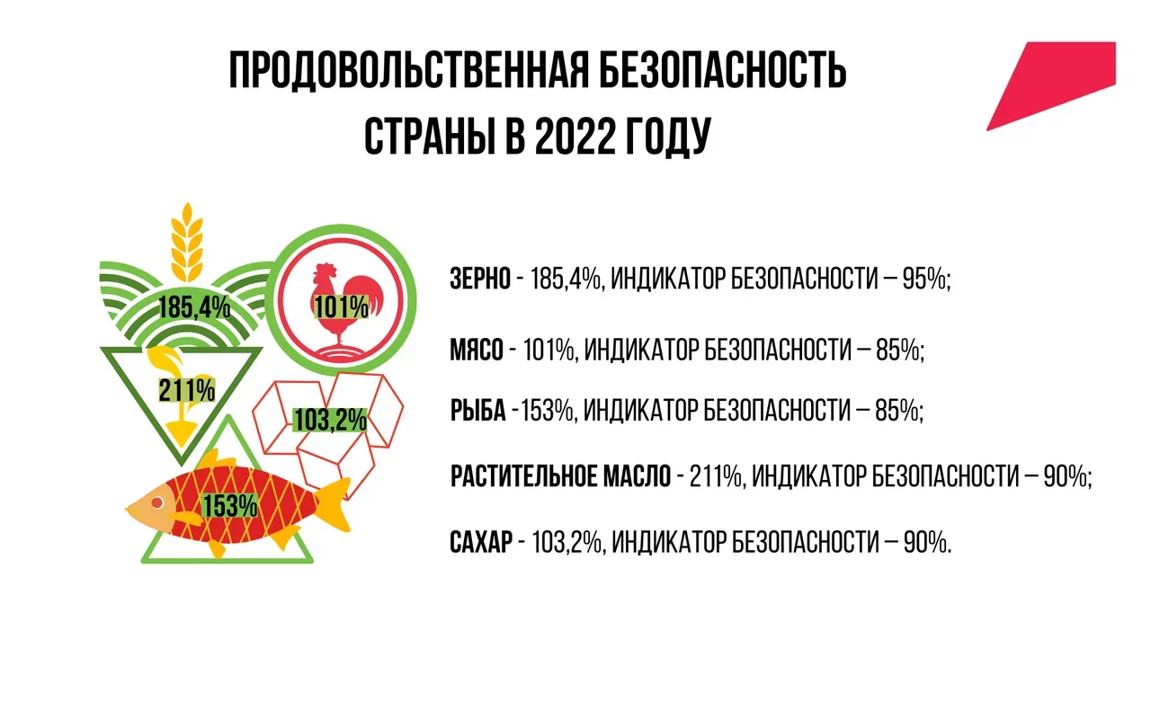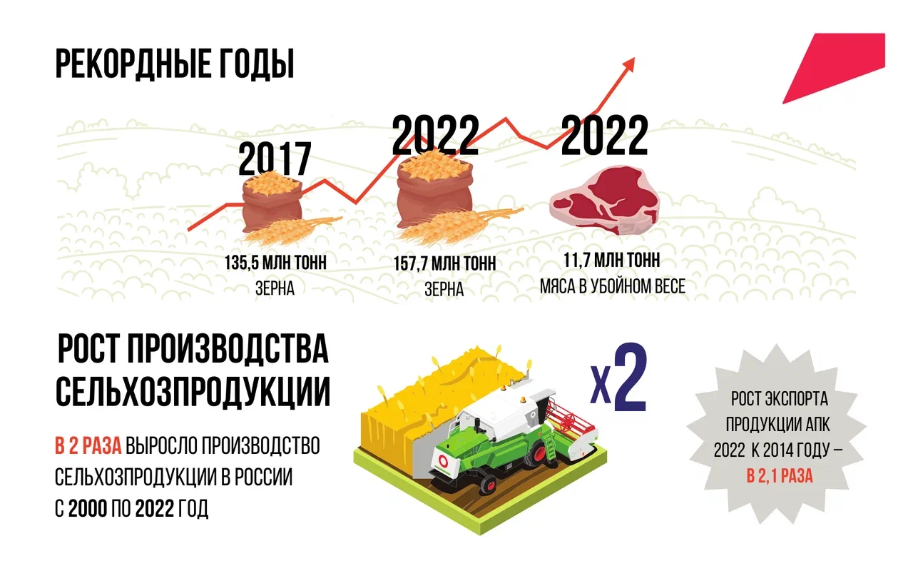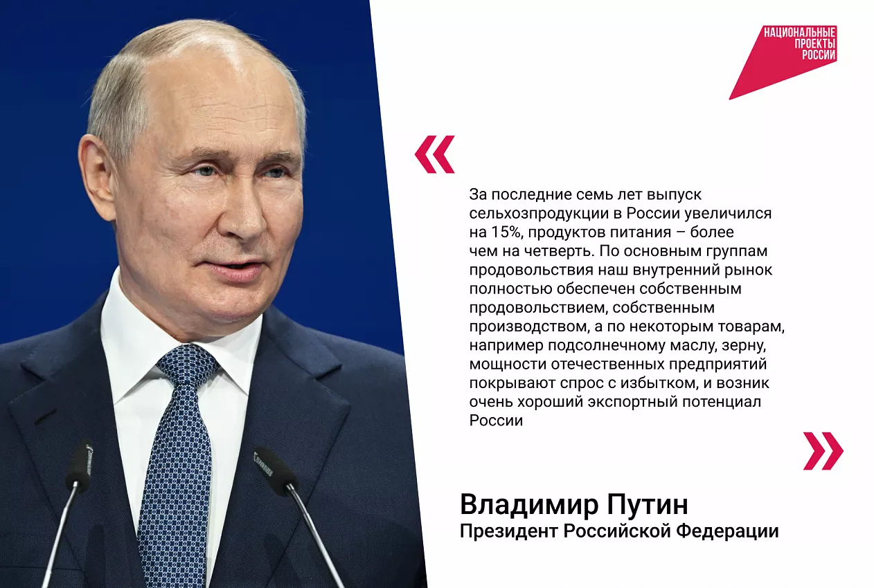 В 2023 году поддержка сельхозпроизводителей усилилась. Цели доктрины продовольственной безопасности по многим важным показателям выполнены. Россия не зависит от импортных поставок зерна, сахара, растительных масел, мяса, рыбы.