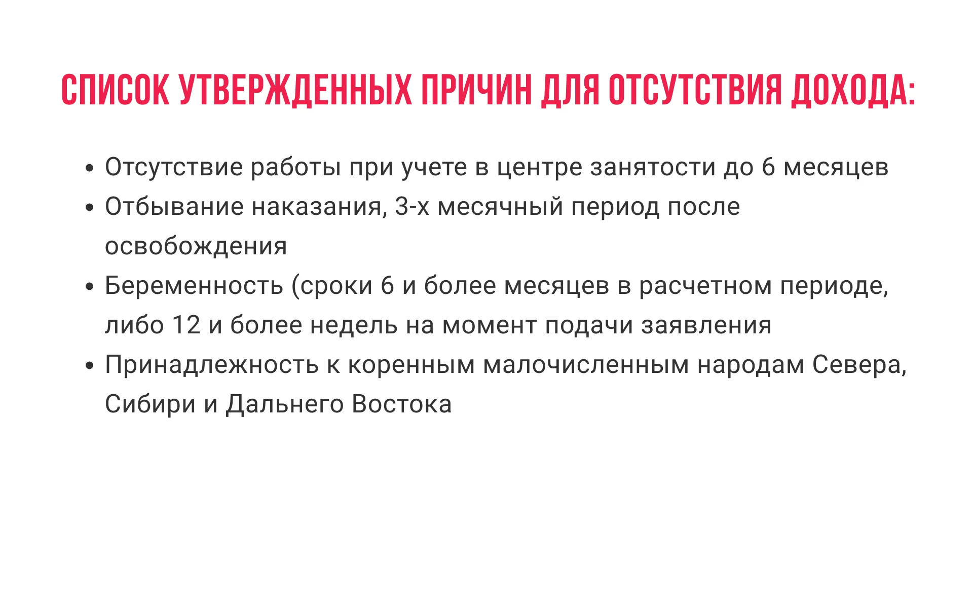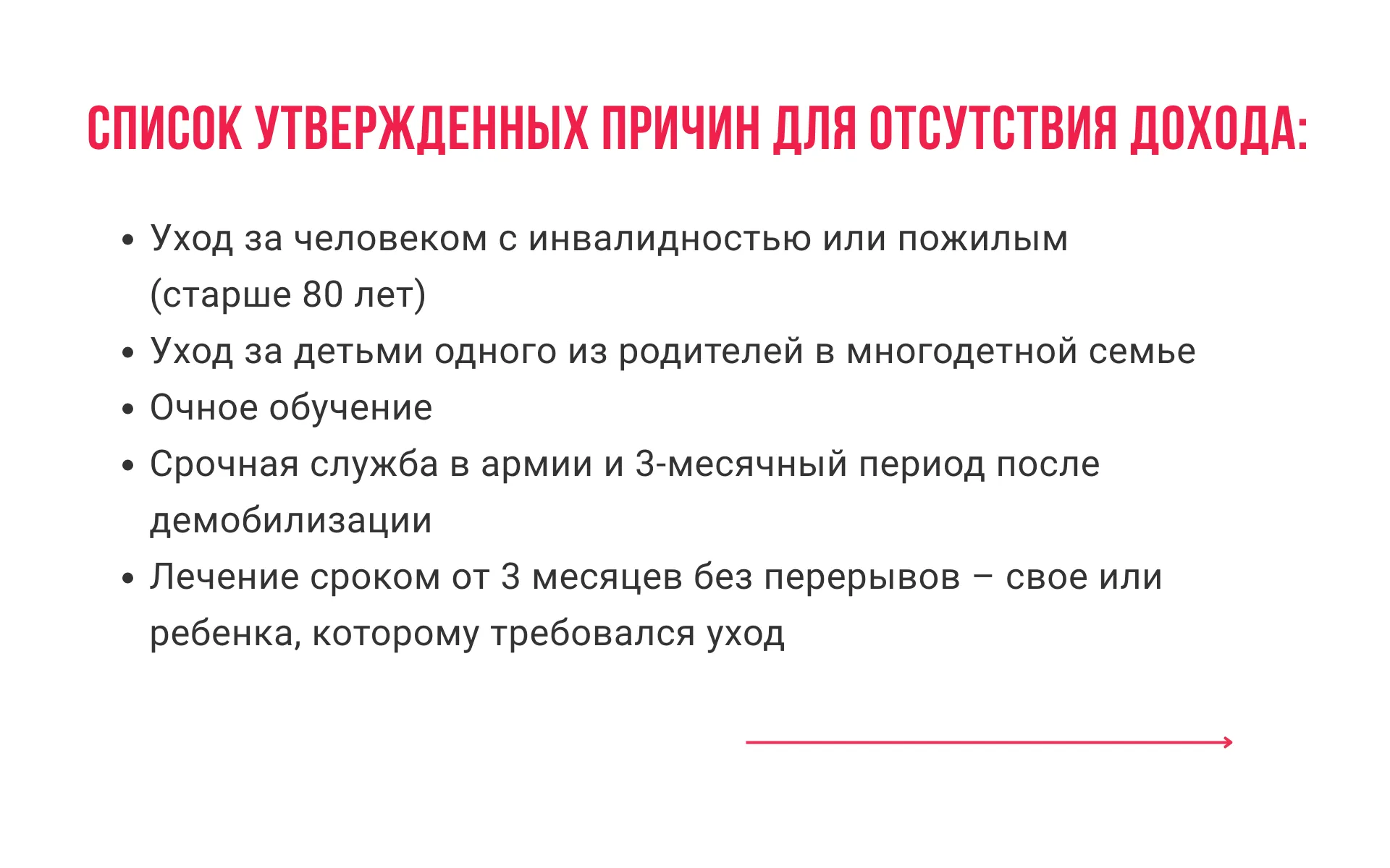 Иногда действует «правило нулевого дохода»: у трудоспособных членов семьи нет заработка в течение десяти месяцев и дольше, но по объективной причине.