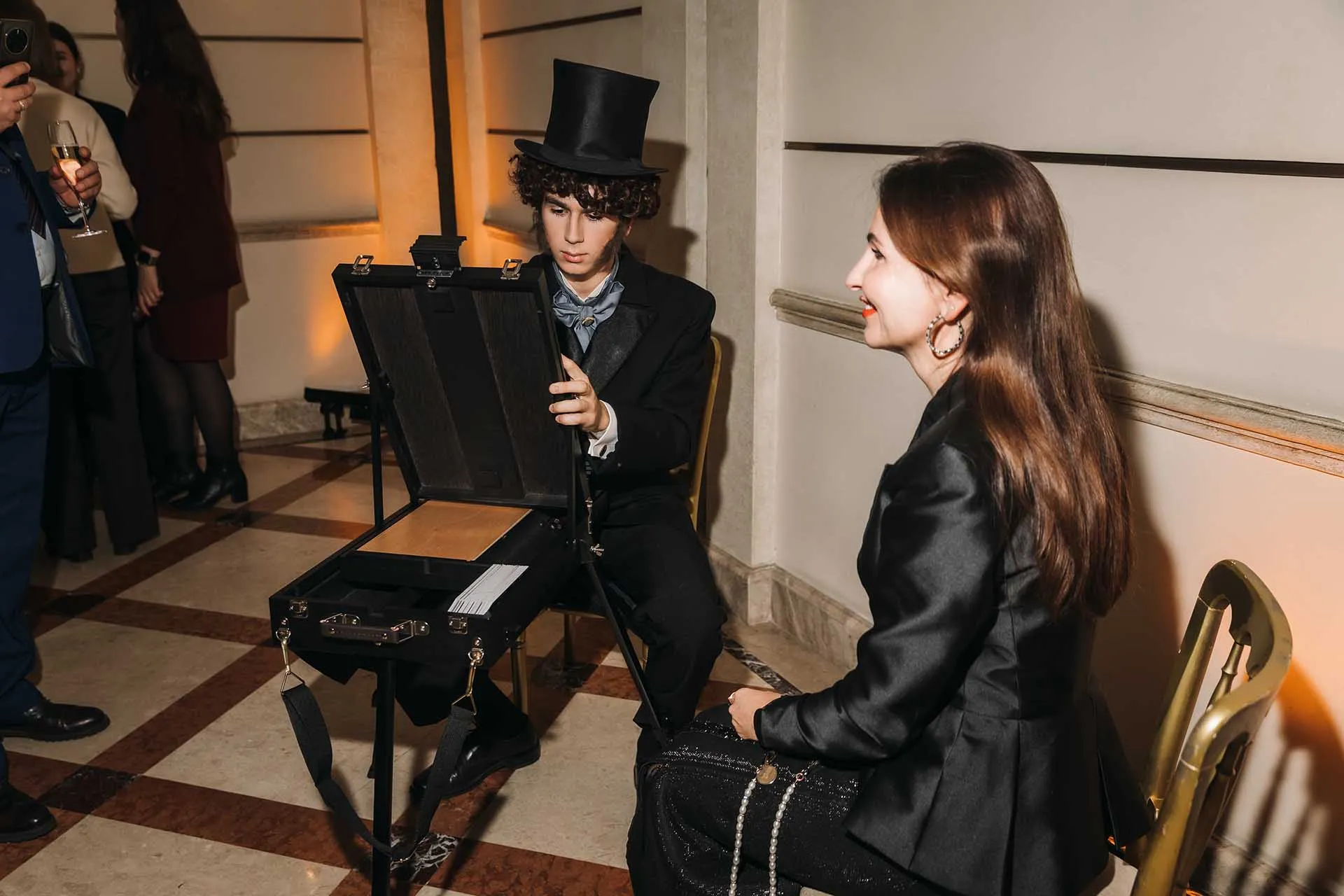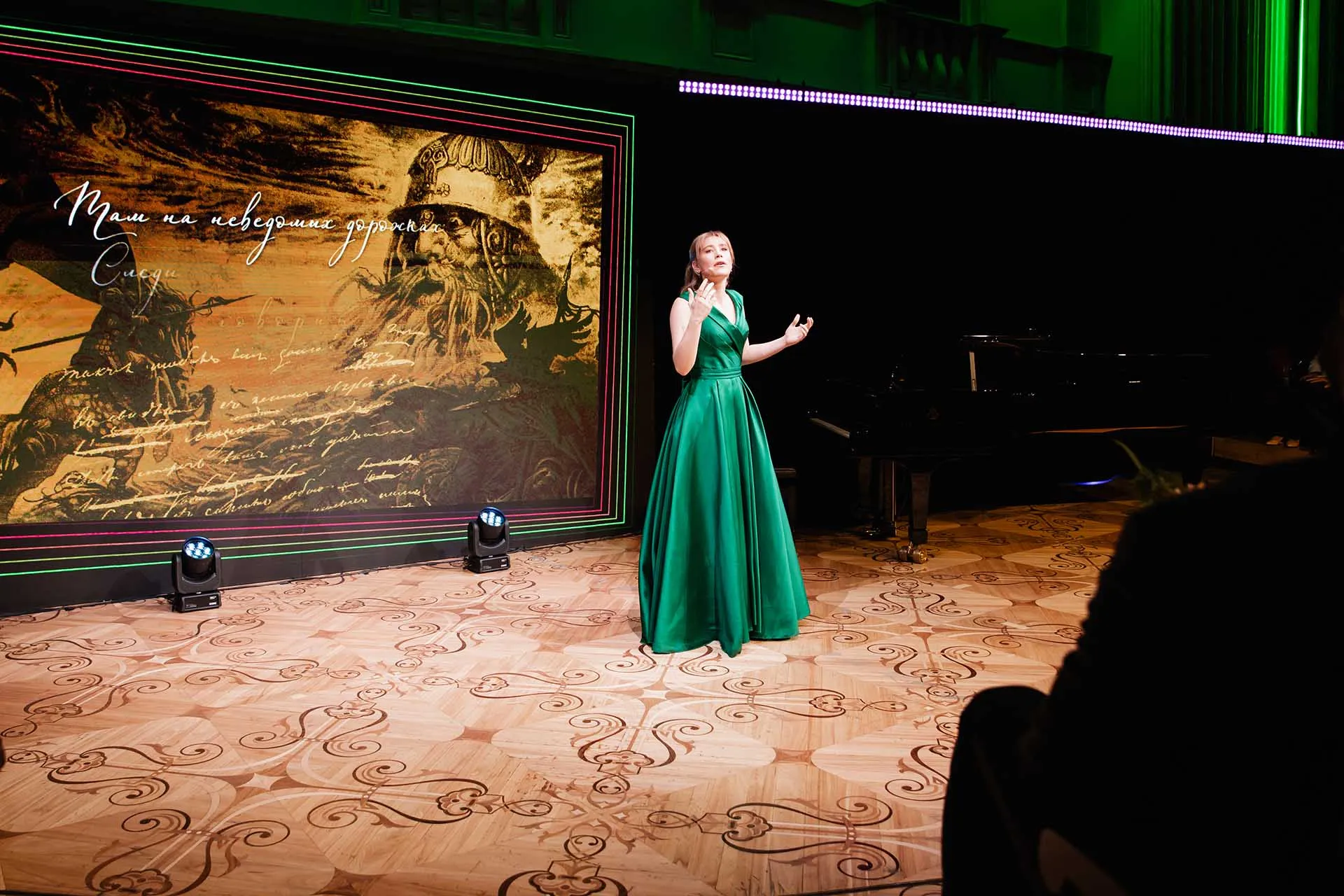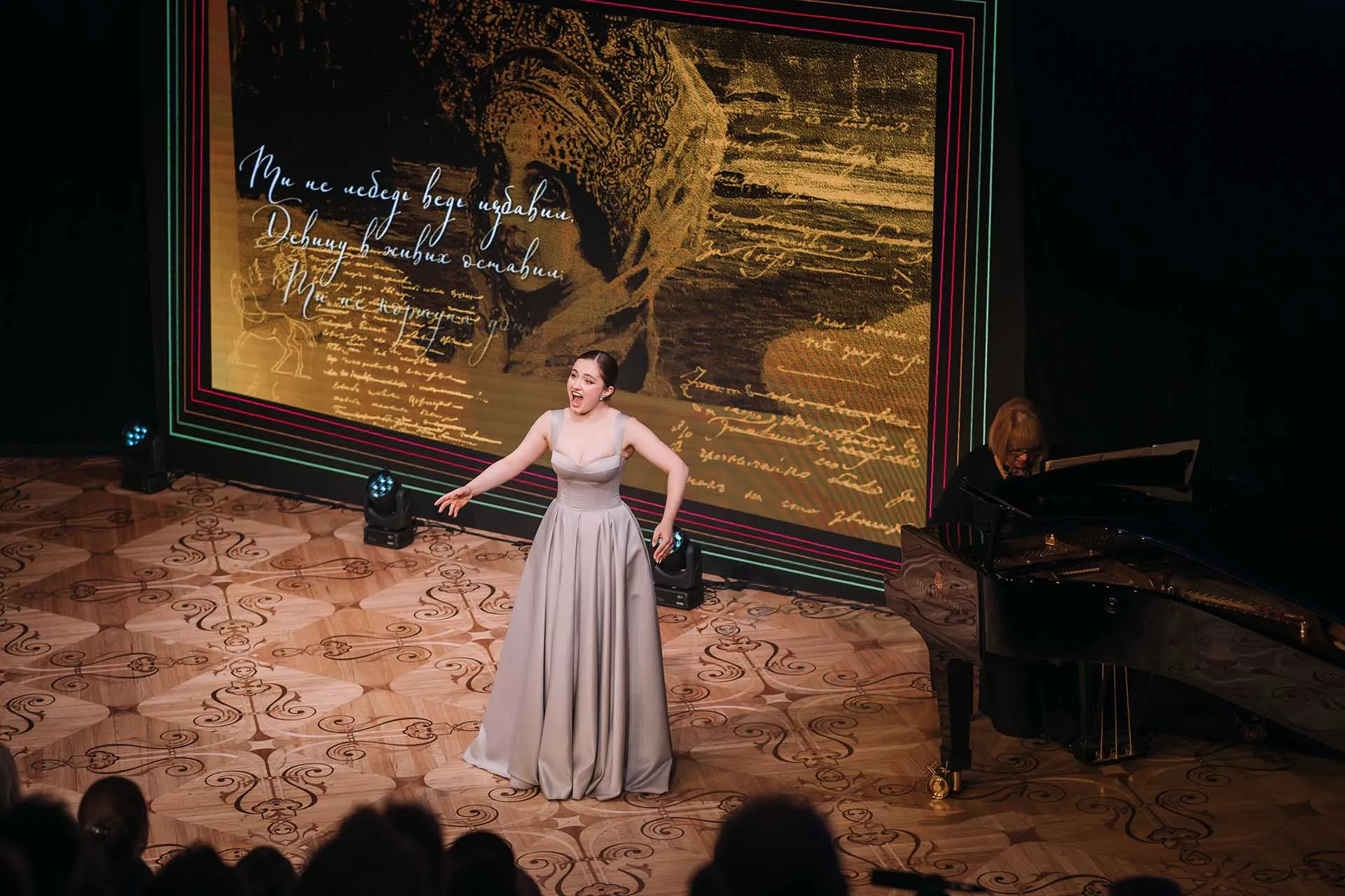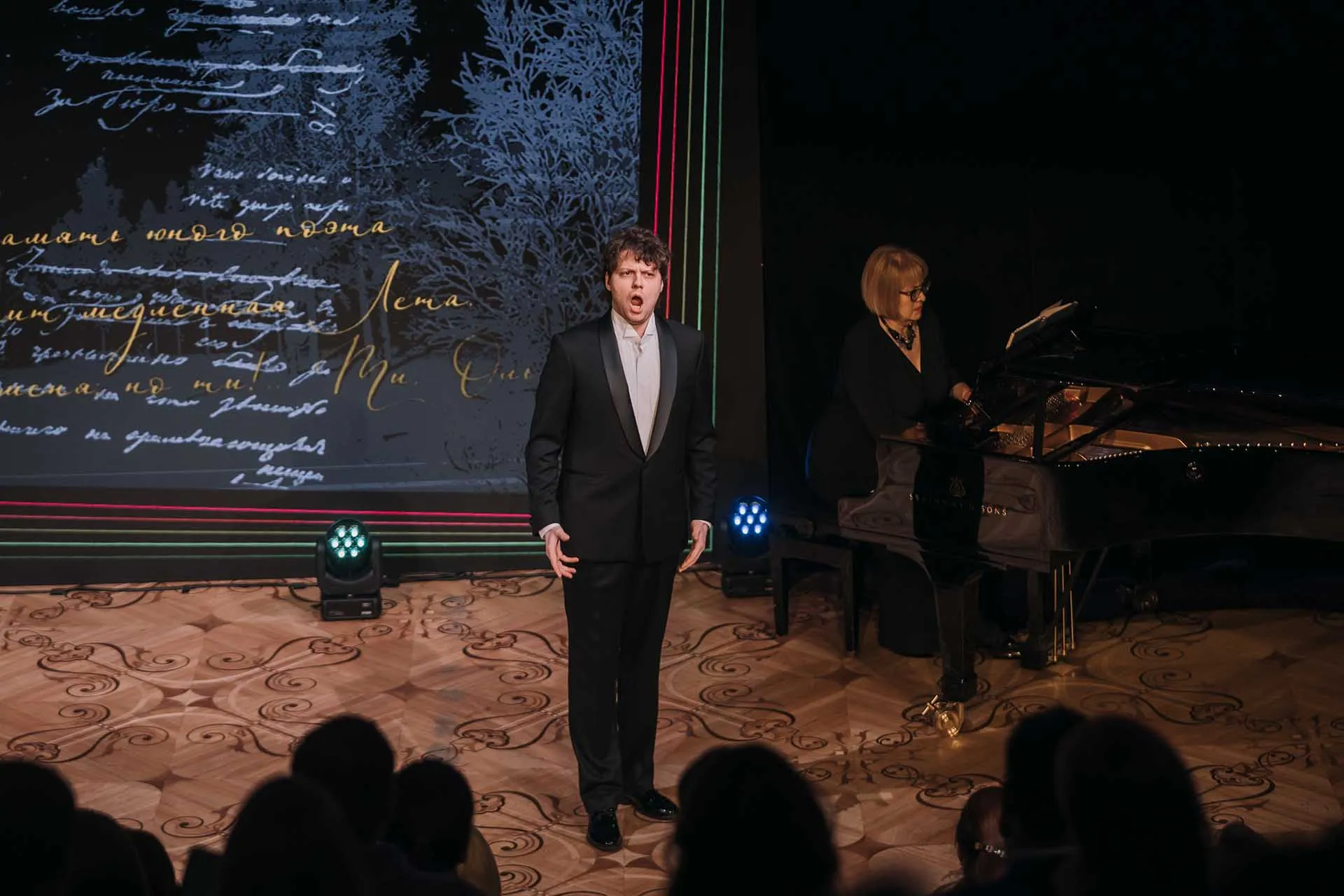 Торжественное мероприятие прошло в необычном театрализованном формате. Фойе Бетховенского зала превратилось в настоящий арт-салон: художники-портретисты и каллиграфы на глазах у гостей создавали открытки. На сцене звучали арии в исполнении артистов Большого театра, артисты Московского драматического театра им. А. С. Пушкина читали стихи поэта. Ведущими вечера стали актеры Евгения Леонова и Николай Рысев.